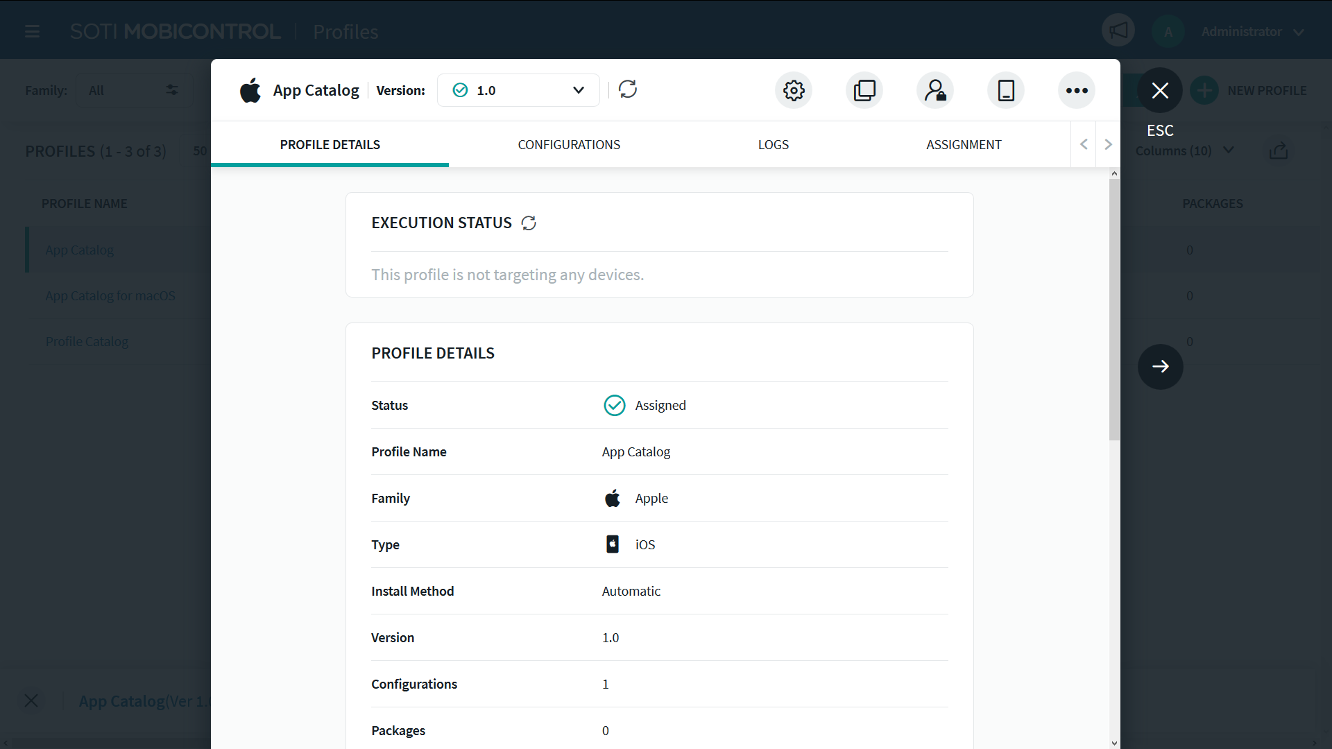 The Profiles view displays an overview of all the profiles present in your SOTI MobiControl instance.