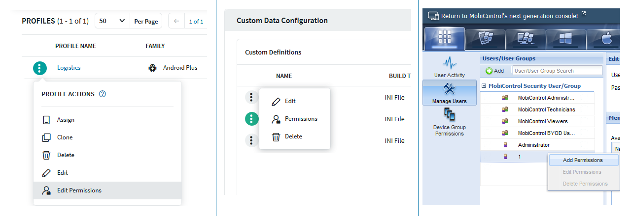 This level of permission setting is only supported on some SOTI MobiControl features. See Enhanced User Permissions for a list of features where it is supported.